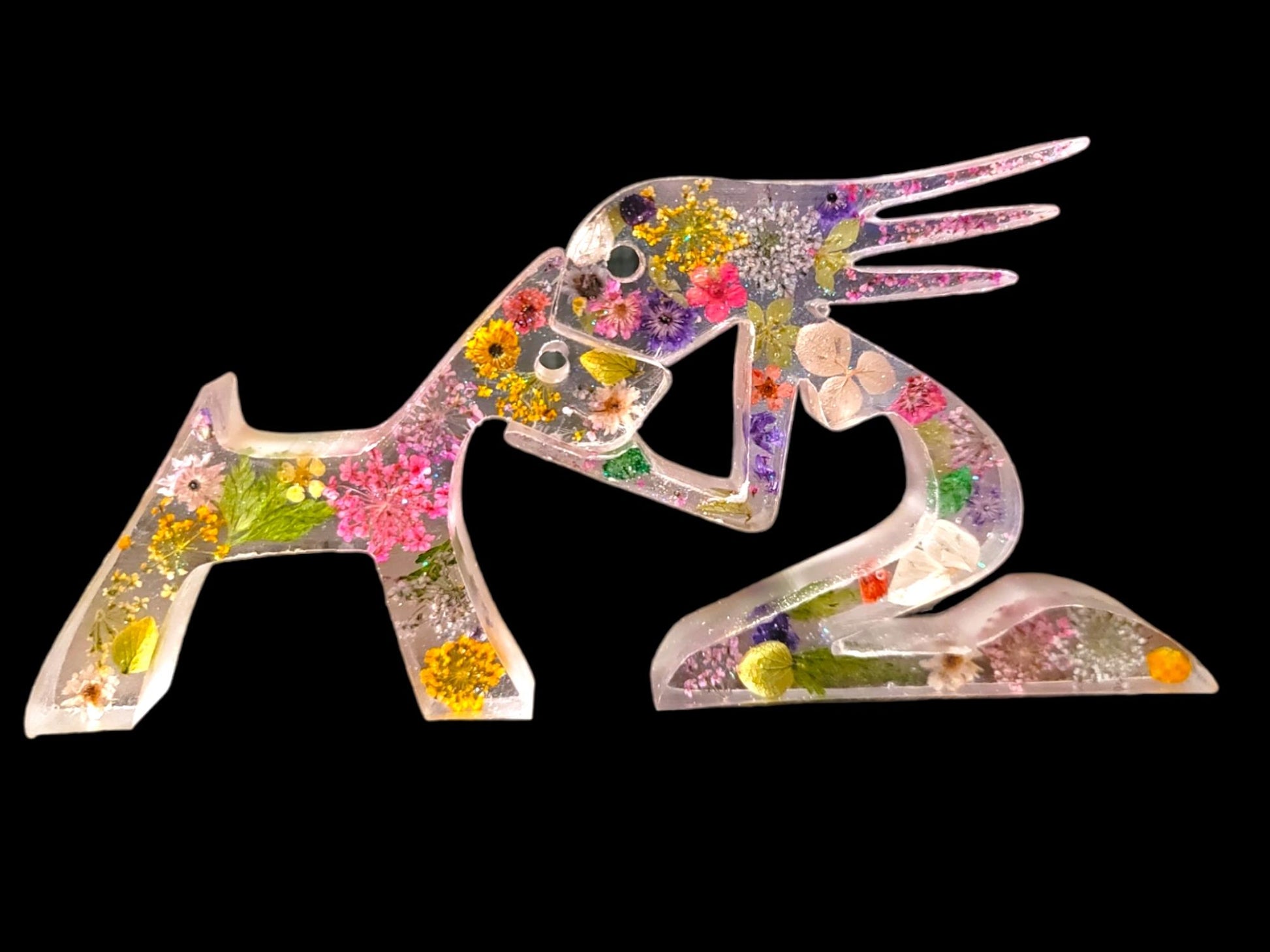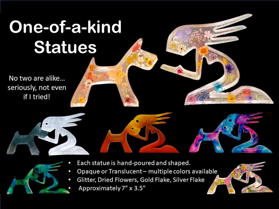 These statues are hand-poured and allowed to cure for 24 hours before shaping. They can include dried flowers or a variety of colors and glitter or flake options. The statues measure approximately 7 inches x 3.5 inches.
