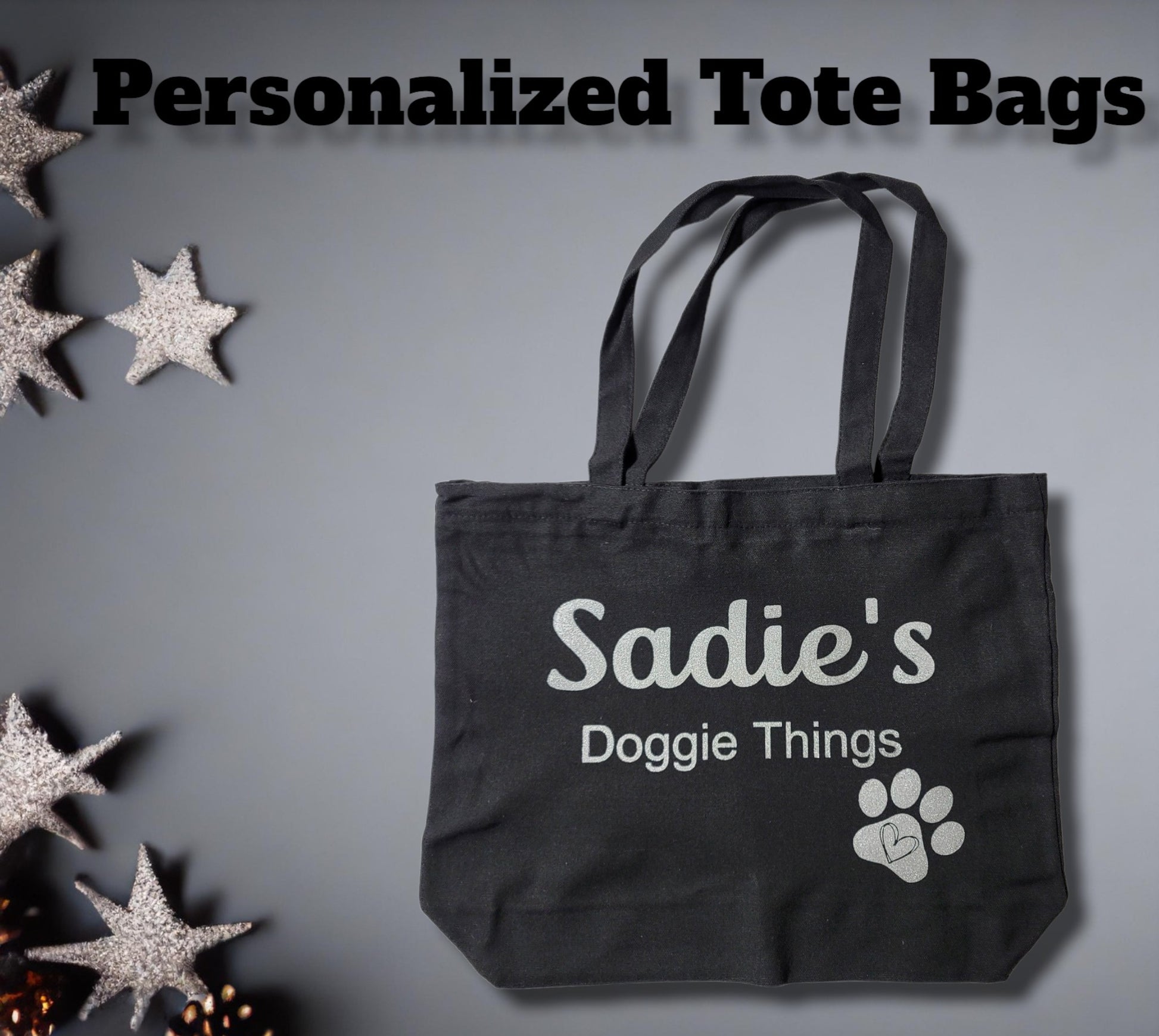 Personalized tote bags are perfect for you and your pup! These durable canvas bags are excellent for keeping blankies, toys, treats, leashes, bowls and more for your fur baby on a car trip, an overnight stay or for a day at the park.